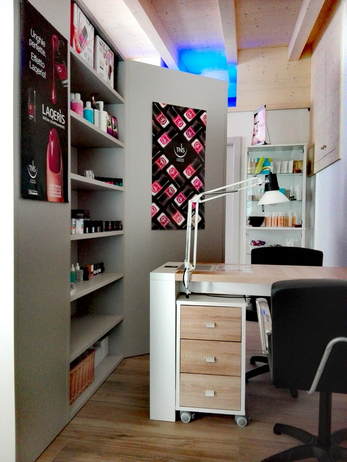 A lato del punto accoglienza/reception vi è una piccola area dedicata alla manicure, dove troverete un’ampia gamma di smalti e semipermanenti della ditta TNS.