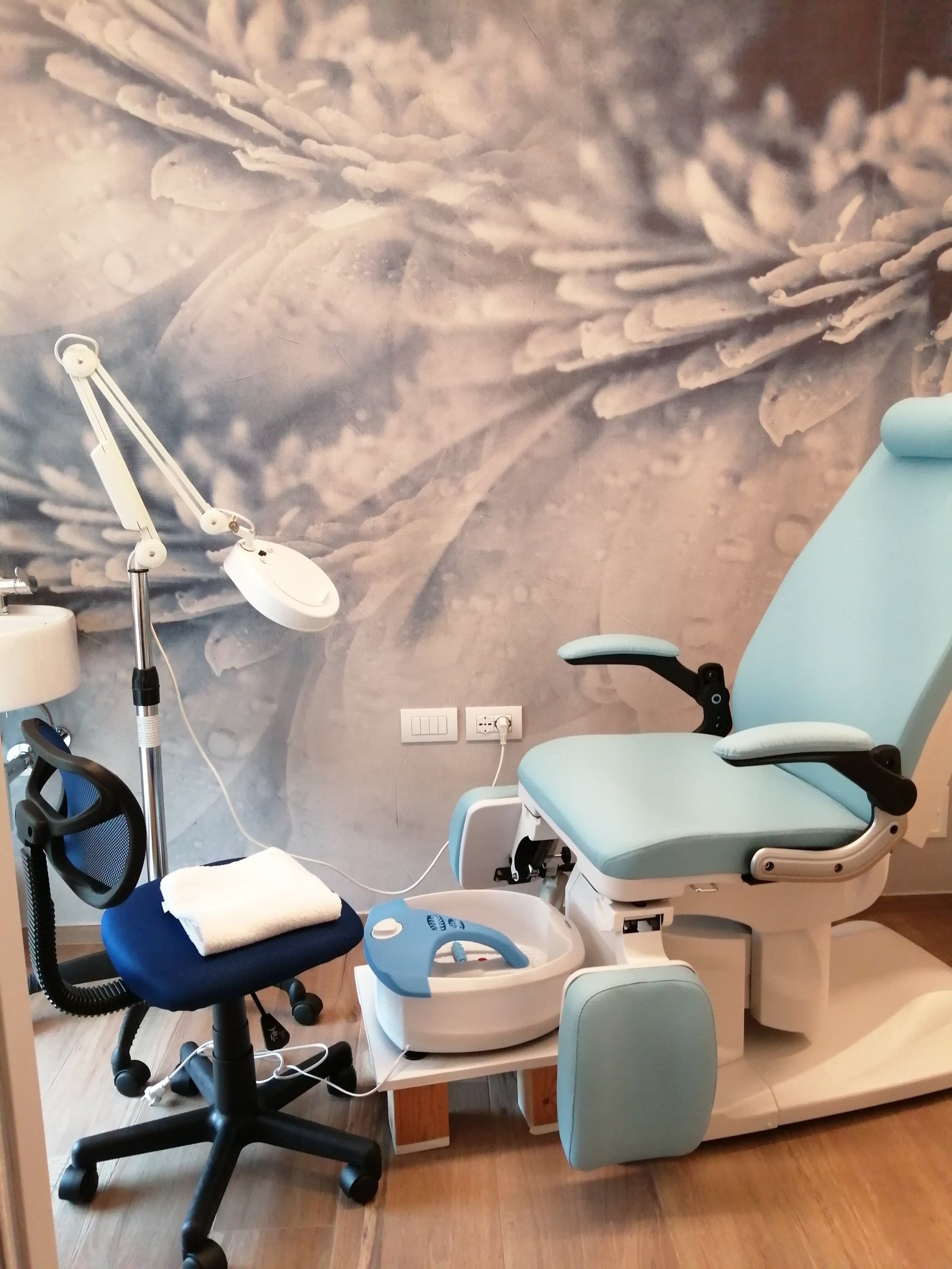 ...disegnata con motivi floreali azzurro blu a lato della poltrona dove vi potrete accomodare e rilassare durante una accurata pedicure, completata da un piccolo massaggio con creme naturali a base di erbe e fiori.